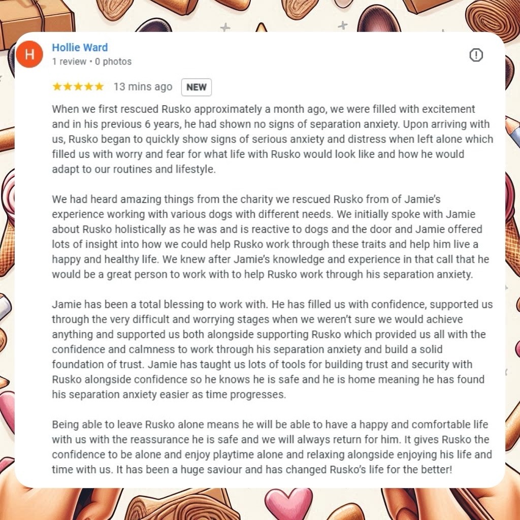 I specialise in helping dogs learn that being alone is safe, predictable, and temporary, using kind, evidence-led methods that focus on emotional security, not suppression.